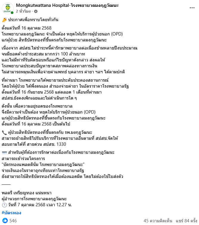 เมื่อวันที่ 7 ตุลาคม 2568 โรงพยาบาลมงกุฎวัฒนะ ประกาศแจ้งเพื่อทราบโดยทั่วกัน ผ่านเพจเฟซบุ๊ก Mongkutwattana Hospital-โรงพยาบาลมงกุฎวัฒนะ โดยระบุว่า ตั้งแต่วันที่ 16 ตุลาคม 2568 โรงพยาบาลมงกุฎวัฒนะ จำเป็นต้อง หยุดให้บริการผู้ป่วยนอก (OPD) แก่ผู้ป่วย สิทธิบัตรทองที่ขึ้นตรงกับโรงพยาบาลมงกุฎวัฒนะ