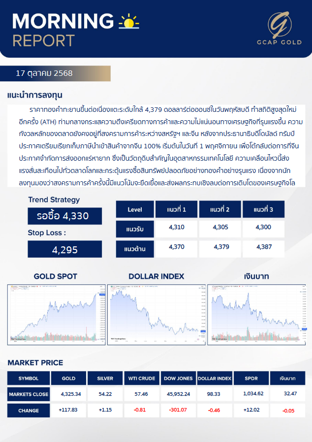 เเนะนำการลงทุนด้านทองคำ รอบเช้าวันนี้ 17 ตุลาคม 2568 โดย บริษัท จีแคป จำกัด ราคาทองคำทะยานขึ้นต่อเนื่อง แตะระดับใกล้ 4,379 ดอลลาร์ต่อออนซ์ในวันพฤหัสบดี ทำสถิติถิติสุดใหม่ อีกครั้ง (ATH) ท่ามกลางกระแสความตึงเครียดทางการค้า และความไม่แน่นอนทางเศรษฐกิจที่รุนแรงขึ้น