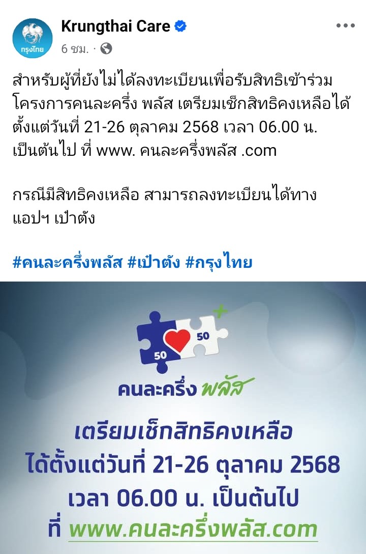 สำหรับผู้ที่ยังไม่ได้ลงทะเบียนเพื่อรับสิทธิเข้าร่วมโครงการคนละครึ่ง พลัส เตรียมเช็กสิทธิคงเหลือได้ตั้งแต่วันที่ 21-26 ตุลาคม 2568 เวลา 06.00 น. เป็นต้นไป ที่ www. คนละครึ่งพลัส .com