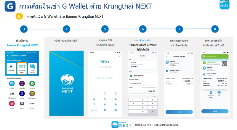 -กรอก G Wallet ID 15 หลัก > ระบุจำนวนเงิน > ตรวจสอบและยืนยัน > รับบัตรคืน