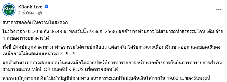 เมื่อวันที่ 23 ตุลาคม 2563 ศุนย์ประชาสัมพันธ์ธนาคารกสิกรไทย ได้ประกาศเเจ้งถึงลูกค้าทุกคน ผ่านช่องทางเพจเฟซบุ๊ก KBank Live โดยระบุว่า ธนาคารขออภัยในความไม่สะดวก ในช่วงเวลา 05:20 น ถึง 06.48 น. ของวันนี้ (23 ต.ค. 2568) ลูกค้าบางท่านอาจไม่สามารถทำธุรกรรมโอน เติม จ่ายผ่านช่องทางธนาคารได้