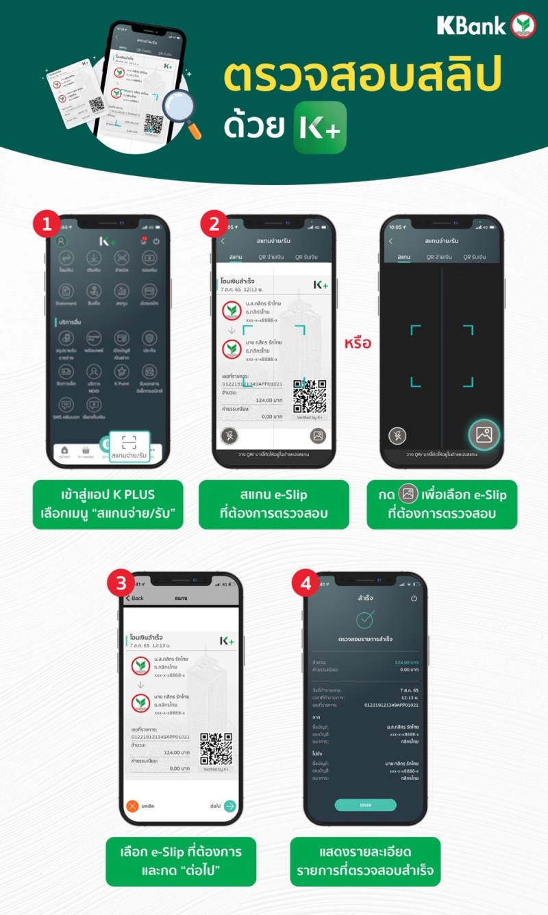 โดยวิธีการตรวจสอบสลิปการโอนเงินผ่าน K PLUS (e-Slip) สามารถทำได้ ดังนี้