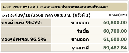 ราคาซื้อขายทองคําในประเทศชนิด 96.5% วันพุธที่ 29 ตุลาคม 2568 (ประกาศครั้งที่ 1)