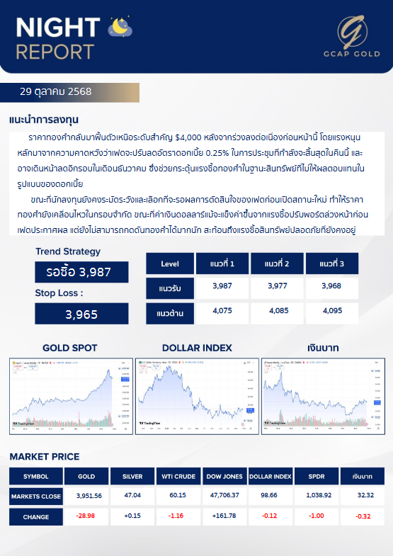 เเนะนำการลงทุนด้านทองคำ รอบเย็นวันนี้ 29 ตุลาคม 2568 โดย บริษัท จีแคป จำกัด ราคาทองคำกลับมาฟื้นตัวเหนือระดับสำคัญ $4,0000 หลังจากร่วงลงต่อเนื่องก่อนหน้านี้ โดยแรงหนุน หลักมาจากความคาดหวังว่าเฟดจะปรับลดอัตราดอกเบี้ย 0.25% ในการประชุมที่กำลังจะสิ้นสุดในคืนคืนนี้ และอาจเดินหน้าลดอีกรอบในเดือนธันวาคม ซึ่งช่วยกระตุ้นแรงซื้อทองคำในฐานะสินทรัพย์ที่ไม่ให้ผลตอบแทนในรูปแบบของดอกเบี้ย