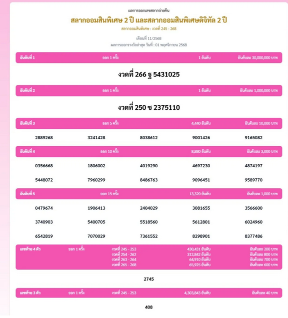 งวดที่ 265-268 จำนวน 65,925 อันดับ อันดับละ 600 บาท