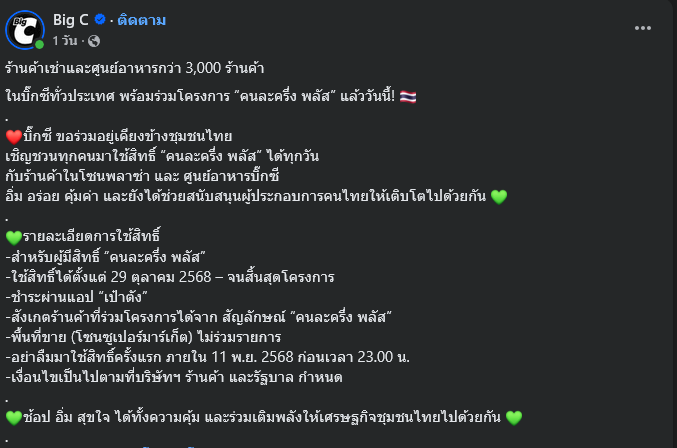 ล่าสุด เพจเฟซบุ๊ก Big C โพสต์ข้อความระบุว่า ร้านค้าเช่า และศูนย์อาหารกว่า 3,000 ร้านค้า ในบิ๊กซีทั่วประเทศ พร้อมร่วมโครงการคนละครึ่งพลัส ได้แล้ว