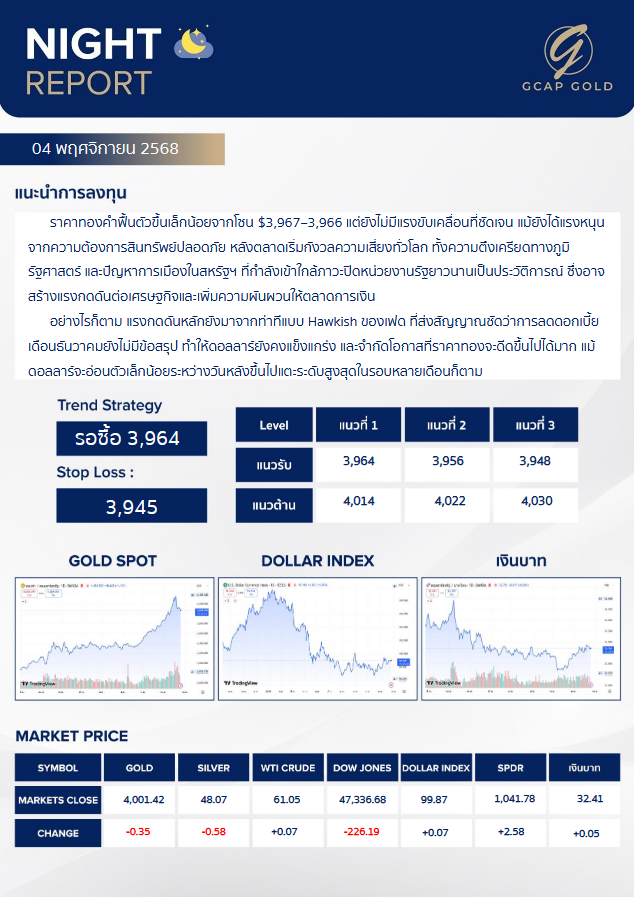 เเนะนำการลงทุนด้านทองคำ รอบเย็นวันนี้ 4 พฤศจิกายน 2568 โดย บริษัท จีแคป จำกัด ราคาทองคำฟื้นตัวขึ้นเล็กน้อยจากโซน $3,967-3,966 แต่ยังไม่มีแรงขับเคลื่อนที่ชัดเจน แม้ยังได้แรงหนุน จากความต้องการสินทรัพย์ปลอดภัย หลังตลาดเริ่มกังวลความเสี่ยงทั่วโลก ทั้งความตึงเครียดทางภูมิ รัฐศาสตร์ และปัญหาการเมืองในสหรัฐฯ ที่กำลังเข้าใกล้ภาวะปิดหน่วยงานรัฐยาวนานเป็นประวัติการณ์ ซึ่งอาจสร้างแรงกดดันต่อเศรษฐกิจ และเพิ่มความผันผวนให้ตลาดการเงิน