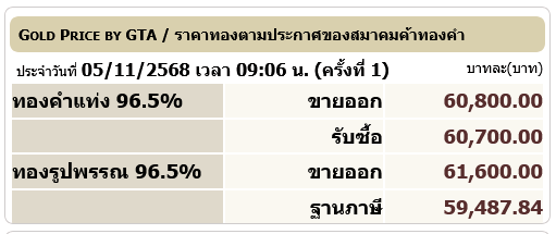 ราคาทองวันนี้ 5 พ.ย. 68 โดย สมาคมค้าทองคำ ประกาศราคาทองครั้งที่ 1 (เปิดตลาด) เมื่อเวลา 09.06 น. ปรับลง 650 บาท ส่งผลให้ราคาทองล่าสุดอยู่ที่