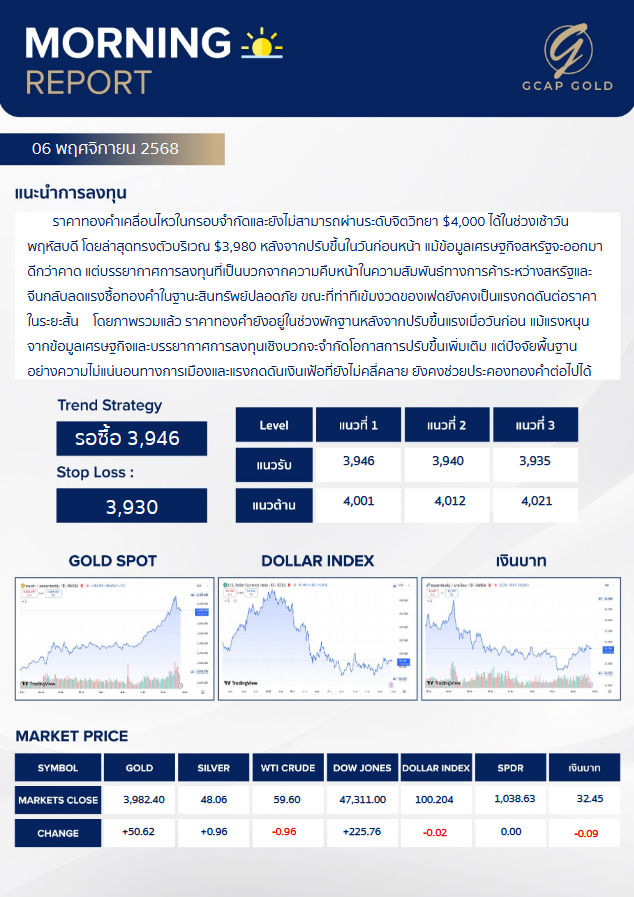 เเนะนำการลงทุนด้านทองคำ รอบเช้าวันนี้ 6 พฤศจิกายน 2568 โดย บริษัท จีแคป จำกัด ราคาทองคำเคลื่อนไหวในกรอบจำกัดและยังไม่สามารถผ่านระดับจิตวิทยา $4,000 ได้ในช่วงเช้าวันพฤหัสบดี โดยล่าสุดทรงตัวบริเวณ $3,980 หลังจากปรับขึ้นในวันก่อนหน้า แม้ข้อมูลเศรษฐกิจสหรัจจะออกมา ดีกว่าคาด แต่บรรยากาศการลงทุนที่เป็นบวกจากความคืบหน้าในความสัมพันธ์ทางการค้าระหว่างสหรัฐและ จีนกลับลดแรงซื้อทองคำในฐานะสินทรัพย์ปลอดภัย