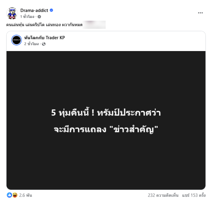 โดยโพสต์ดังกล่าวเป็นการแชร์ข้อความมาจาก เพจเฟซบุ๊ก ทันโลกกับ Trader KP ซึ่งได้เผยข้อมูลเตือนว่า ในเวลา 23.00 น. คืนนี้ โดนัลด์ ทรัมป์ ประธานาธิบดีสหรัฐฯ เตรียมออกแถลง ข่าวสำคัญ แต่ไม่ได้มีการเปิดเผยรายละเอียดว่าเกี่ยวข้องกับประเด็นใด