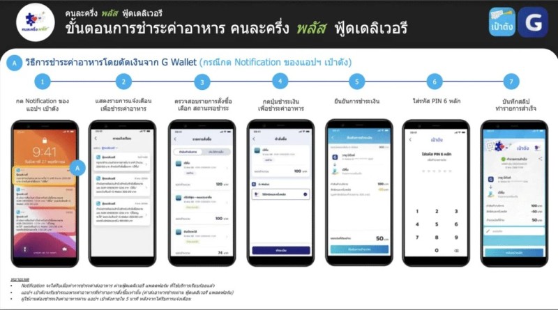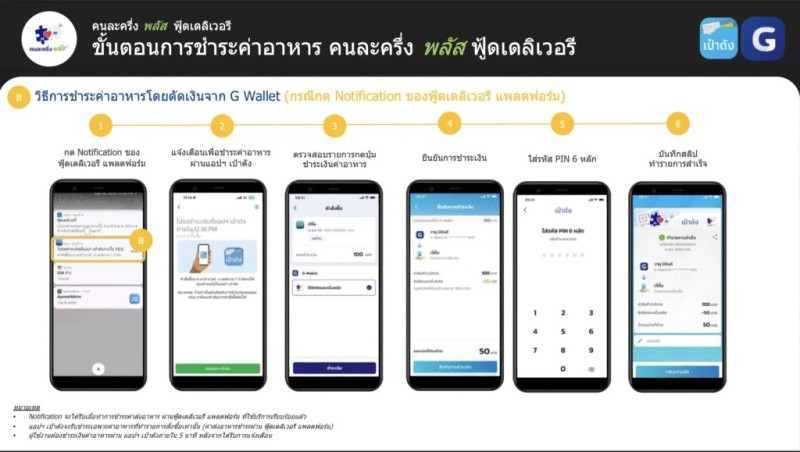 การชำระเงินค่าอาหาร (ไม่รวมค่าจัดส่ง) จะทำผ่าน G Wallet ในแอปเป๋าตัง ต้องดำเนินการภายใน 5 นาทีหลังได้รับแจ้งเตือน