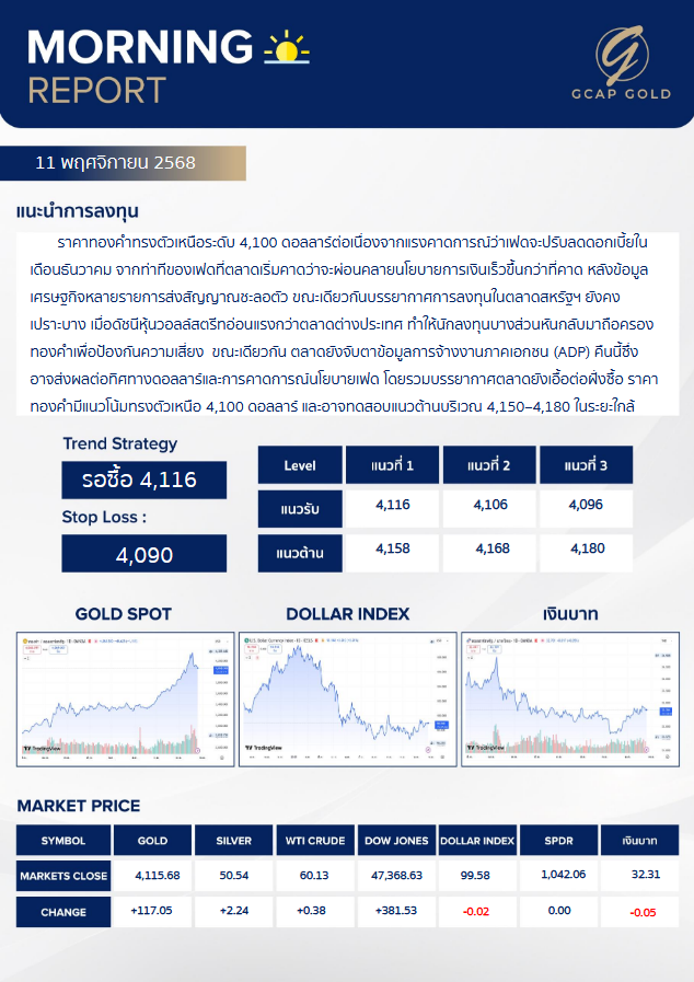 เเนะนำการลงทุนด้านทองคำ รอบเช้าวันนี้ 11 พฤศจิกายน 2568 โดย บริษัท จีแคป จำกัด ราคาทองคำทรงตัวเหนือระดับ 4,100 ดอลลลาร์ต่อเนื่องจากแรงคาดการณ์ว่าเฟดจะปรับลดดอกเบี้ย ในเดือนธันวาคม จากท่าทีของเฟดที่ตลาดเริ่มคาดว่าจะผ่อนคลายนโยบายการเงินเร็วขึ้นกว่าที่คาด หลังข้อมูล เศรษฐกิจหลายรายการส่งสัญญาณชะลอตัว