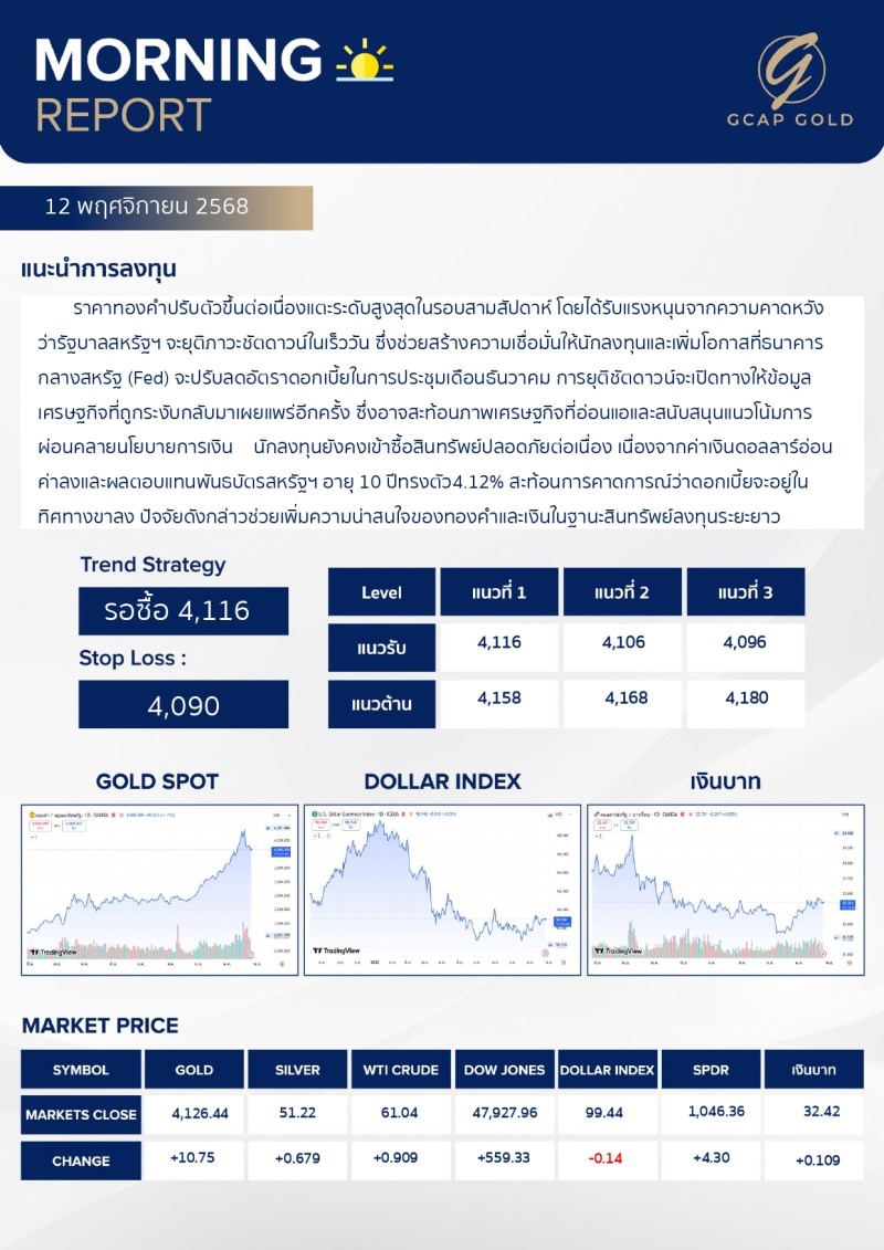 เเนะนำการลงทุนด้านทองคำ รอบเช้าวันนี้ 12 พฤศจิกายน 2568 โดย บริษัท จีแคป จำกัด ราคาทองคำปรับตัวขึ้นต่อเนื่อง แตะระดับสูงสุดในรอบสามสัปดาห์ โดยได้รับแรงหนุนจากความคาดหวังว่ารัฐบาลสหรัฐฯ จะยุติภาวะชัตดาวน์ในเร็ววัน ซึ่งช่วยสร้างความเชื่อมั่นให้นักลงทุนและเพิ่มโอกาสที่ธนาคารกลางสหรัฐ (Fed) จะปรับลดอัตราดอกเบี้ยในการประชุมเดือนธันวาคม การยุติชัตดาวน์จะเปิดทางให้ข้อมูลเศรษฐกิจที่ถูกระงับกลับมาเผยแพร่อีกครั้ง