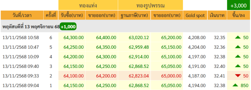 ราคาทองวันนี้ 13 พฤศจิกายน 2568 โดย สมาคมค้าทองคำ ประกาศราคาทองครั้งที่ 1 (เปิดตลาด) เมื่อเวลา 09.04 น. ปรับตัวขึ้น 850 บาท สู่บริเวณ 64,250 บาท เมื่อเทียบกับประกาศราคาซื้อขายครั้งสุดท้ายของเมื่อวาน (วันพุธ) ที่ระหว่างวันมีการประกาศราคาทองคำทั้งหมด 16 ครั้ง รวมราคาปรับตัวลดลง 100 บาท