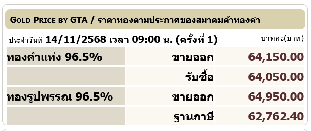 ราคาทองวันนี้ 14 พฤศจิกายน 2568 โดย สมาคมค้าทองคำ ประกาศราคาทองครั้งที่ 1 (เปิดตลาด) เมื่อเวลา 09:00 น. ปรับลง 600 บาท เมื่อเทียบกับราคาซื้อขายครั้งสุดท้ายของเมื่อวาน(พฤหัสบดี) ที่ระหว่างวันมีการประกาศราคาทองคำทั้งหมด 16 ครั้ง รวมเพิ่มขึ้นมากถึง 1,350 บาท สู่บริเวณ 64,750 บาท