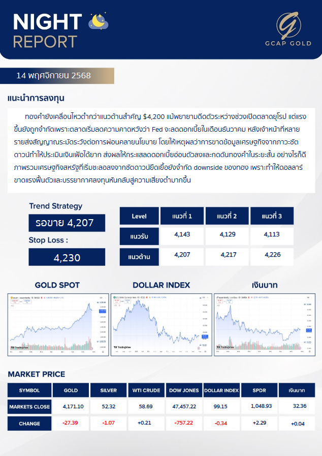 เเนะนำการลงทุนด้านทองคำ รอบเย็นวันนี้ 14 พฤศจิกายน 2568 โดย บริษัท จีแคป จำกัด ทองคำยังเคลื่อนไหวต่ำกว่าแนวต้านสำคัญ $4,200 แม้พยายามดีดตัวระหว่างช่วงเปิดตลาดยุโรป แต่แรงขึ้นยังถูกจำกัดเพราะตลาดเริ่มลดความคาดหวังว่า Fed จะลดดอกเบี้ยในเดือนธันวาคม หลังเจ้าหน้าที่หลายรายส่งสัญญาณระมัดระวังต่อการผ่อนคลายนโยบาย โดยให้เหตุผลว่าการขาดข้อมูลเศรษฐกิจจากภาวะชัดดาวน์ทำให้ประเมินเงินเฟ้อได้ยาก
