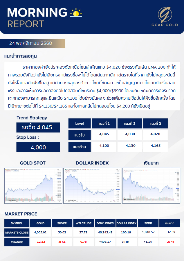เเนะนำการลงทุนด้านทองคำ รอบเช้าวันนี้ 24 พฤศจิกายน 2568 โดย บริษัท จีแคป จำกัด ราคาทองคำยังประคองตัวเหนือโซนสำคัญแถว $4,020 ซึ่งตรงกับเส้น EMA 200 ทำให้ภาพรวมยังถือว่ายังไม่เสียทรง แม้แรงซื้อจะไม่ได้โดดเด่นมากนัก แต่ตราบใดที่ราคายังไม่หลุดระดับนี้ ยังให้โอกาสกับฝั่งขึ้นอยู่ แต่ถ้าทองหลุดลงต่ำกว่าโซนนี้ชัดเจน จะเป็นสัญญาณว่าโมเมนตัมเริ่มอ่อนแรง และอาจเห็นการย่อตัวลงต่อไปทดสอบที่โซนระดับ $4,000/$3990 ได้เช่นกัน