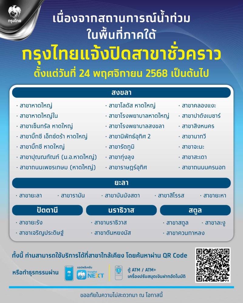 วันที่ 24 พฤศจิกายน 2568 เพจเฟซบุ๊ก Krungthai Care ของธนาคารกรุงไทย ได้โพสต์ข้อความระบุว่า เนื่องจากสถานการณ์น้ำท่วมในพื้นที่ภาคใต้ของประเทศไทย ส่งผลกระทบกับการให้บริการบางส่วน กรุงไทย แจ้งปิดให้บริการสาขาชั่วคราว ในพื้นที่ที่ได้รับผลกระทบ ครอบคลุม 5 จังหวัด รวมทั้งสิ้น 33 สาขา ตั้งแต่วันที่ 24 พฤศจิกายน 2568 เป็นต้นไป