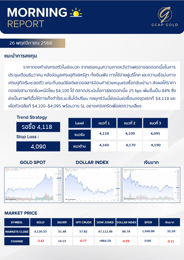 เเนะนำการลงทุนด้านทองคำ รอบเช้าวันนี้ 26 พฤศจิกายน 2568 โดย บริษัท จีแคป จำกัด ราคาทองคำยังทรงตัวในเชิงบวก จากแรงหนุนความคาดหวังว่าเฟดอาจลดดอกเบี้ยในการประชุมเดือนธันวาคม หลังข้อมูลเศรษฐกิจสหรัฐฯ ทั้งเงินเฟ้อ การใช้จ่ายผู้บริโภค และความเชื่อมั่นทางเศรษฐกิจเริ่มชะลอตัว