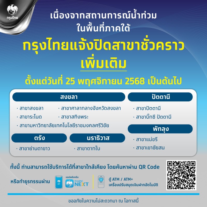 วันที่ 25 พฤศจิกายน 2568 ที่ผานมา ศูนย์ประชาสัมพันธ์ธนาคารกรุงไทย ออกประกาศเเจ้งเตือนผู้ใช้บริการ ผ่านเพจเฟซบุ๊ก Krungthai Care โดยระบุว่า เนื่องจากสถานการณ์น้ำท่วมในพื้นที่ภาคใต้ของประเทศไทย ส่งผลกระทบกับการให้บริการบางส่วน กรุงไทยแจ้งปิดให้บริการสาขาชั่วคราว ในพื้นที่ที่ได้รับผลกระทบ ตั้งแต่วันที่ 25 พฤศจิกายน 2568 เป็นต้นไป