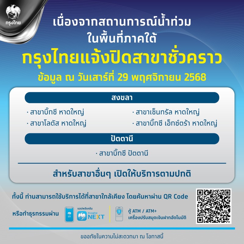 เมื่อวันที่ 29 พฤศจิกายน 2568 ธนาคารกรุงไทย ได้ประกาศแจ้งถึงลูกค้าทุกคน ผ่านเพจเฟซบุ๊ก Krungthai Care โดยระบุว่า เนื่องจากสถานการณ์น้ำท่วมในพื้นที่ภาคใต้ของประเทศไทย ส่งผลกระทบกับการให้บริการบางส่วน กรุงไทยแจ้งปิดให้บริการสาขาชั่วคราว ในพื้นที่ที่ได้รับผลกระทบ รวม 5 สาขา