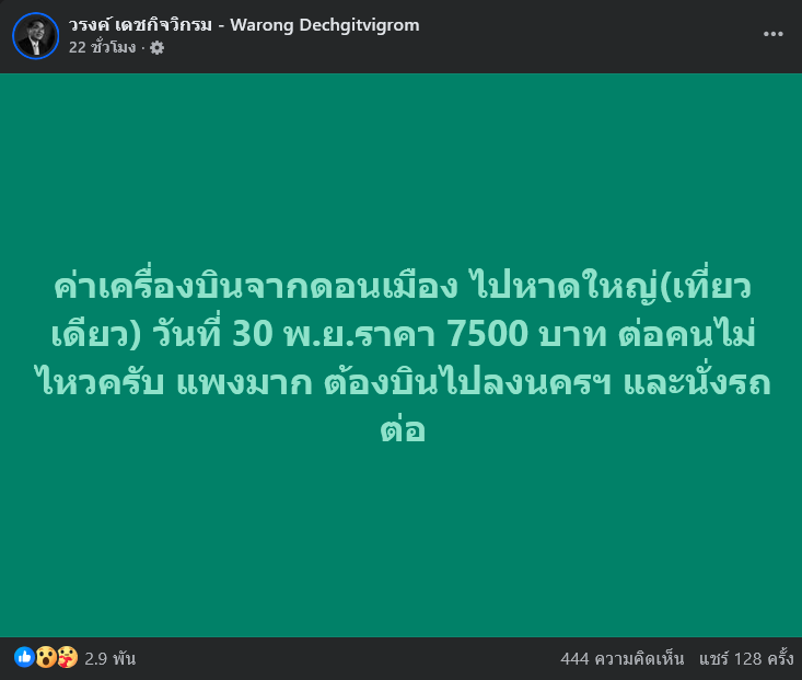 ล่าสุด นพ.วรงค์ เดชกิจวิกรม หัวหน้าพรรคไทยภักดี ได้ออกมาโพสต์ข้อความ ผ่านเฟซบุ๊ก วรงค์ เดชกิจวิกรม - Warong Dechgitvigrom โดยระบุว่า ค่าเครื่องบินจากดอนเมือง ไปหาดใหญ่(เที่ยวเดียว) วันที่ 30 พ.ย.ราคา 7500 บาท ต่อคนไม่ไหวครับ แพงมาก ต้องบินไปลงนครฯ และนั่งรถต่อ