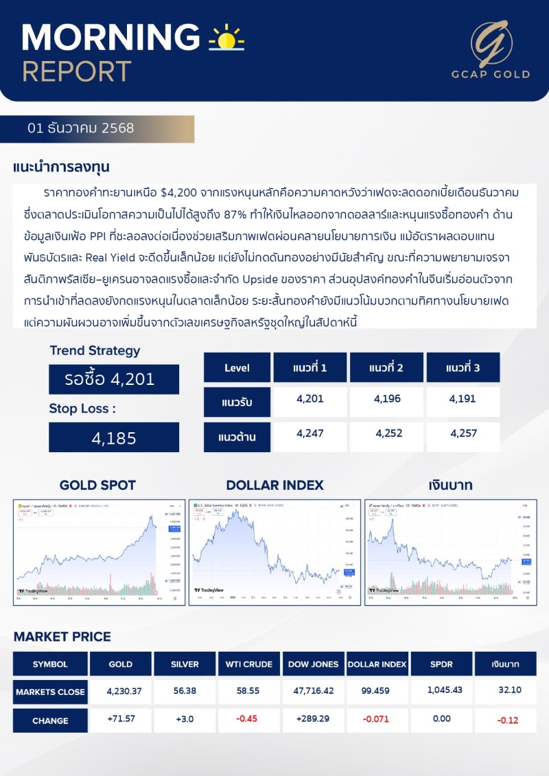 เเนะนำการลงทุนด้านทองคำ รอบเช้าวันนี้ 1 ธันวาคม 2568 โดย บริษัท จีแคป จำกัด ราคาทองคำทะยานเหนือ $4,200 จากแรงหนุนหลักคือความคาดหวังว่าเฟดจะลดดอกเบี้ยเดือนธันวาคม ซึ่งตลาดประเมินโอกาสความน่าจะเป็นได้สูงถึง 87%