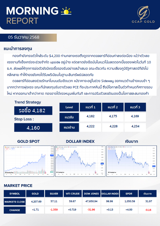 เเนะนำการลงทุนด้านทองคำ รอบเช้าวันนี้ 5 ธันวาคม 2568 โดย บริษัท จีแคป จำกัด ทองคำยังกรงตัวใกล้ระดับ $4,200 ท่ามกลางแรงดึงดูดจากดอลลาร์ที่อ่อนค่าลงต่อเนื่อง แม้ว่าตัวเลขแรงงานที่แข็งแกร่งจะช่วยจำกัด upside อยู่บ้าง แต่ตลาดยังเชื่อมั่นในแนวโน้มลดดอกเบี้ยของเฟดในวันที่ 10 ธ.ค. ส่งผลให้ทุกการย่อตัวยังมีแรงซื้อรองรับอย่างสม่ำเสมอ