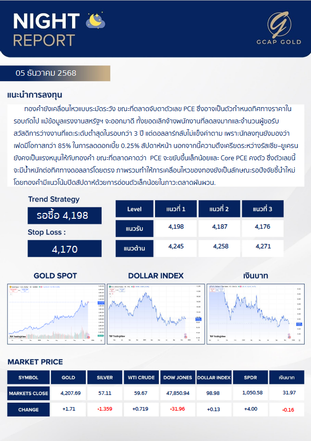 เเนะนำการลงทุนด้านทองคำ รอบเย็นวันนี้ 5 ธันวาคม 2568 โดย บริษัท จีแคป จำกัด ทองคำยังเคลื่อนไหวแบบระมัดระวัง ขณะที่ตลาดจับตาตัวเลข PCE ซึ่งอาจเป็นตัวกำหนดทิศทางราคาในรอบถัดไป แม้ข้อมูลแรงงานสหรัฐฯ จะออกมาดี ทั้งยอดเลิกจ้างพนักงานที่ลดลงมากและจำนวนผู้ขอรับ สวัสติการว่างงานที่แตะระดับต่ำสุดในรอบกว่า 3 ปี แต่ดอลลาร์กลับไม่แข็งค่าตาม เพราะนักลงทุนยังมองว่า เฟดมีโอกาสกว่า 85% ในการลดดอกเบี้ย 0.25% สัปดาห์หน้า