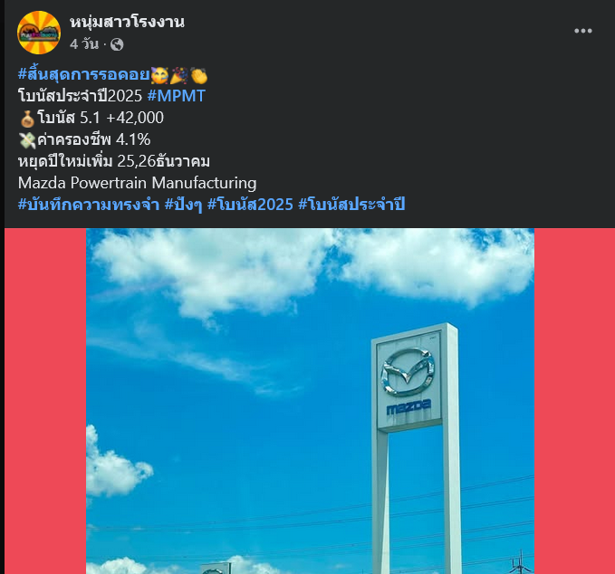 ล่าสุดเพจ หนุ่มสาวโรงงาน ได้ออกมาเผยรายละเอียดโบนัส ของ บริษัท มาสด้า พาวเวอร์เทรน แมนูแฟคเจอริ่ง (ประเทศไทย) จำกัด ระบุว่า สิ้นสุดการรอคอย โบนัสประจำปี 2025 MPMT