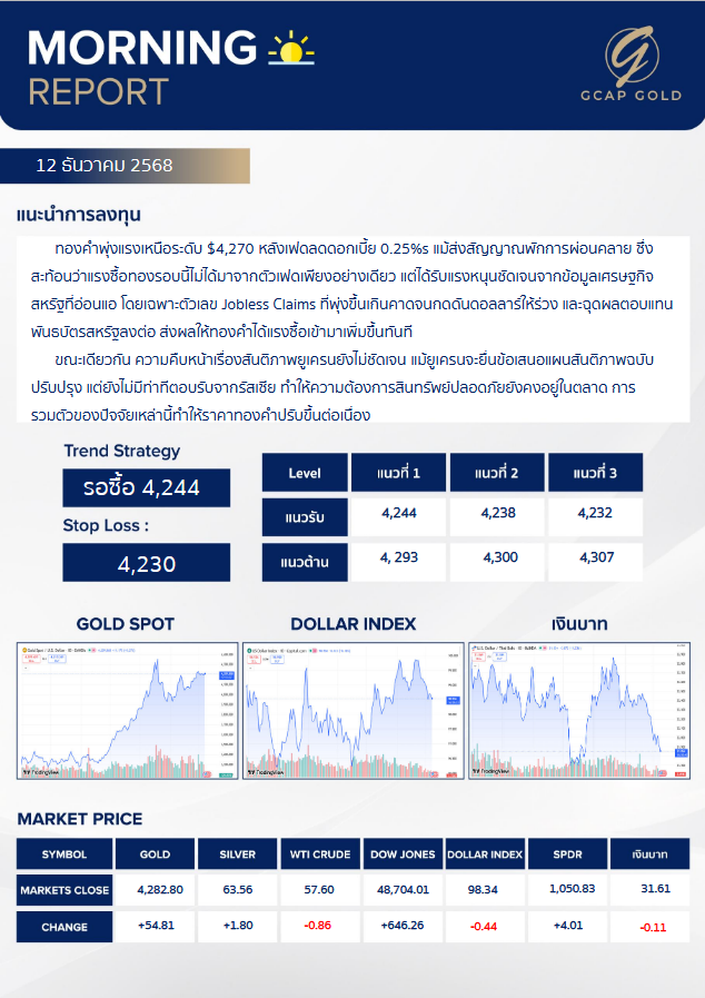 เเนะนำการลงทุนด้านทองคำ รอบเช้าวันนี้ 12 ธันวาคม 2568 โดย บริษัท จีแคป จำกัด ทองคำพุ่งแรงเหนือระดับ $4,270 หลังเฟดลดดอกเบี้ย 0.25%s แม้ส่งสัญญาณพักการผ่อนคลาย ซึ่งสะท้อนว่าแรงซื้อทองรอบนี้ไม่ได้มาจากตัวเฟดเพียงอย่างเดียว แต่ได้รับแรงหนุนชัดเจนจากข้อมูลเศรษฐกิจสหรัฐที่อ่อนแอ โดยเฉพาะตัวเลข Jobless Claims ที่พุ่งขึ้นเกินคาดจนกดดันดอลลาร์ให้ร่วง และฉุดผลตอบแทนพันธบัตรสหรัฐลงต่อ ส่งผลให้ทองคำได้แรงซื้อเข้ามาเพิ่มขึ้นทันที