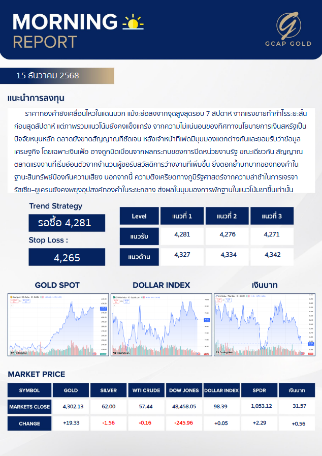 เเนะนำการลงทุนด้านทองคำ รอบเช้าวันนี้ 15 ธันวาคม 2568 โดย บริษัท จีแคป จำกัด ราคาทองคำยังเคลื่อนไหวในแดนบวก แม้จะย่อลงจากจุดสูงสุดรอบ 7 สัปดาห์ จากแรงขายทำกำไรระยะสั้น ก่อนสุดสัปดาห์ แต่ภาพรวมแนวโน้มยังคงแข็งแกร่ง จากความไม่แน่นอนของทิศทางนโยบายการเงินสหรัฐเป็นปัจจัยหนุนหลัก ตลาดยังขาดสัญญาณที่ชัดเจน หลังเจ้าหน้าที่เฟดมีมมองแตกต่างกันและยอมรับว่าข้อมูลเศรษฐกิจ โดยเฉพาะเงินเฟ้อ อาจถูกบิดเบือนจากผลกระทบของการปิดหน่วยงานรัฐ