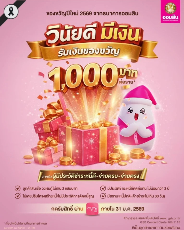 รายงานข่าวจากธนาคารออมสิน เปิดเผยว่า ธนาคารออมสิน ร่วมส่งมอบความสุขในช่วงเทศกาลต้อนรับปีใหม่ 2569 จัดเตรียมของขวัญ เพื่อส่งความสุขให้ประชาชน ภายใต้โครงการ “วินัยดี มีเงิน” ให้แก่ลูกค้าธนาคารด้วยการมอบเงินของขวัญพิเศษรายละ 1,000 บาท ให้แก่ลูกหนี้ที่ใช้บริการสินเชื่อวงเงินกู้ไม่เกิน 200,000 บาท มีประวัติชำระหนี้ดีติดต่อกันไม่น้อยกว่า 3 ปี ไม่เคยปรับโครงสร้างหนี้/ไม่มีประวัติการตัดหนี้สูญ และมีสถานะหนี้ปกติ (ค้างชำระไม่เกิน 30 วัน)