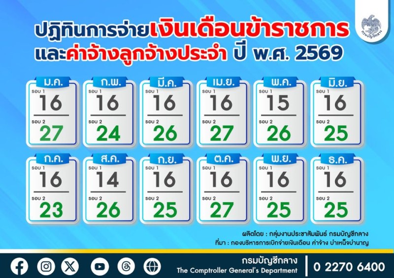 กรมบัญชีกลาง กระทรวงการคลัง ได้ประกาศปฏิทินการจ่ายเงินเดือนข้าราชการและค่าจ้างลูกจ้างประจำ ประจำปี พ.ศ. 2569 โดยกำหนดให้จ่ายเงินเดือน 2 รอบต่อเดือน เพื่อความสะดวกในการบริหารจัดการทางการเงินของผู้ปฏิบัติงานภาครัฐ ผู้รับสิทธิสามารถตรวจสอบวันโอนเงินเข้าบัญชี สามารถตรวจสอบวันโอนได้แล้ว