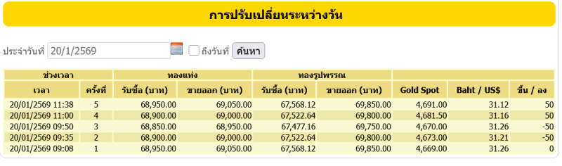 อัปเดตราคาทองล่าสุด 20 มกราคม 2569 หลังเช้านี้ สมาคมค้าทองคำ ประกาศราคาทองครั้งที่ 1 (เปิดตลาด) เมื่อเวลา 09.08 น. คงที่ไม่เปลี่ยนแปลง เมื่อเทียบกับประกาศราคาซื้อขายครั้งสุดท้ายของเมื่อวาน(อังคาร) ที่ระหว่างวันประกาศราคาทองคำทั้งหมด 9 ครั้ง รวมปรับเพิ่มขึ้นแรง 600 บาท ทำสถิติสูงสุดเป็นประวัติการณ์ครั้งใหม่บริเวณ 69,050 บาท