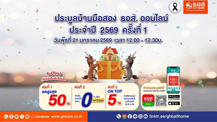 น.ส.อรนุช พงษ์ประยูร รองกรรมการผู้จัดการ กลุ่มงานปรับโครงสร้างหนี้ ธนาคารอาคารสงเคราะห์ (ธอส.) เปิดเผยว่า ธอส. พร้อมเดินหน้าสานต่อพันธกิจ “ทำให้คนไทยมีบ้าน” ผ่านช่องทางที่เข้าถึงได้อย่างสะดวกยิ่งขึ้นจัดงาน “ประมูลบ้านมือสอง ธอส. ออนไลน์ ประจำปี 2569 ครั้งที่ 1” ในวันพุธที่ 21 ม.ค. 69 ระหว่างเวลา 12.00-12.30 น. ผ่าน Application : GHB ALL HOME โดยนำทรัพย์เด่น ทำเลดี ราคาคุ้มค่ากว่า1,600 รายการทั่วประเทศ ทั้งประเภทบ้านเดี่ยว บ้านแฝด ทาวน์เฮ้าส์ อาคารพาณิชย์ และที่ดินเปล่า มาจำหน่ายในราคาพิเศษ ด้วยส่วนลดสูงสุดถึง 50% จากราคาปกติ