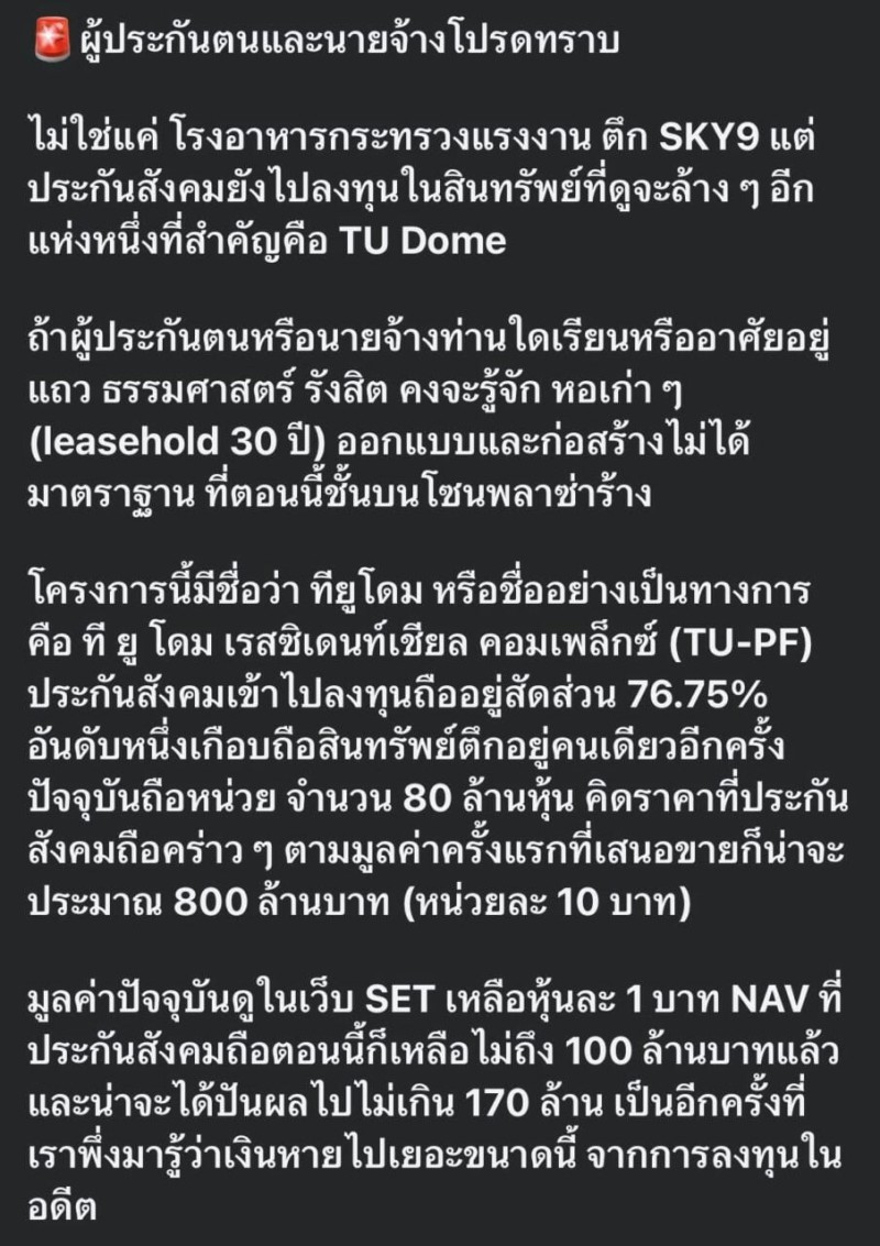 เมื่อวันที่ 22 ม.ค. 2569 Progressive Social Security โพสต์ผ่าน X ว่าผู้ประกันตนและนายจ้างโปรดทราบ ไม่ใช่แค่ โรงอาหารกระทรวงแรงงาน ตึก SKY9 แต่ประกันสังคมยังไปลงทุนในสินทรัพย์ที่ดูจะร้าง ๆ อีกแห่งหนึ่งที่สำคัญคือ TU Dome ถ้าผู้ประกันตนหรือนายจ้างท่านใดเรียนหรืออาศัยอยู่แถว ธรรมศาสตร์ รังสิต คงจะรู้จัก หอเก่า ๆ (leasehold 30 ปี) ออกแบบและก่อสร้างไม่ได้มาตราฐาน ที่ตอนนี้ชั้นบนโชนพลาช่าร้าง