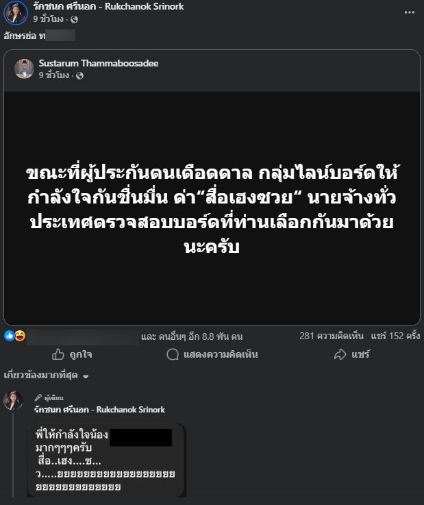 ก่อนที่ ไอซ์ - รักชนก ศรีนอก ผู้สมัคร ส.ส.บัญชีรายชื่อ พรรคประชาชน จะแชร์โพสต์ดังกล่าวและเขียนแคปชั่นว่า อักษรย่อ ท. พร้อมคอมเมนต์ด้วยภาพแชตซึ่ง มีผู้ใช้ไลน์รายหนึ่งพิมพ์ข้อความคำว่า พี่ให้กำลังใจน้อง…มากๆๆๆครับ สื่อเฮงซวยยยยยย