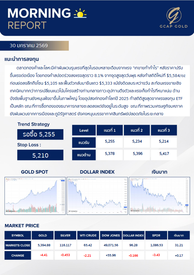 เเนะนำการลงทุนด้านทองคำ รอบเช้าวันนี้ 30 มกราคม 2569 โดย บริษัท จีแคป จำกัด ตลาดทองคำและโลหะมีค่าผันผวนรุนแรงที่สุดในรอบหลายเดือนจากแรง เทขายทำกำไร หลังราคาปรับขึ้นแรงต่อเนื่อง โดยทองคำสปอตร่วงลงแรงสุดราว 8.1% จากจุดสูงสุดในวันพุธ หลังทำสถิติใหม่ที่ $5,584/oz ก่อนย่อลงลึกถึงโซน $5,105 และฟื้นตัวกลับมายืนแถว $5,333 แม้ยังติดลบระหว่างวัน สะท้อนแรงขายเชิงเทคนิคมากกว่าการเปลี่ยนแนวโน้มโครงสร้างท่ามกลางภาวะอุปทานตึงตัวและแรงเก็งกำไรที่หนาแน่น