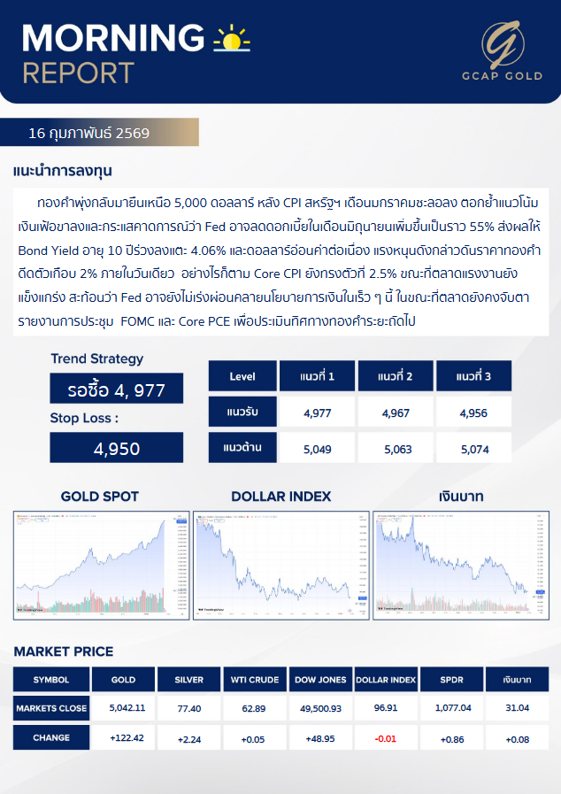 เเนะนำการลงทุนด้านทองคำ รอบเช้าวันนี้ 16 กุมภาพันธ์ 2569 โดย บริษัท จีแคป จำกัด ทองคำพุ่งกลับมายืนเหนือ 5,000 ดอลลาร์ หลัง CPI สหรัฐฯ เดือนมกราคมชะลอลง ตอกย้ำแนวโน้มเงินเฟ้อขาลงและกระแสคาดการณ์ว่า Fed อาจลดดอกเบี้ยในเดือนมิถุนายนเพิ่มขึ้นเป็นราว 55% ส่งผลให้ Bond Yield อายุ 10 ปีร่วงลงแตะ 4.06% และดอลลาร์อ่อนค่าต่อเนื่อง แรงหนุนดังกล่าวดันราคาทองคำดีดตัวเกือบ 2% ภายในวันเดียว