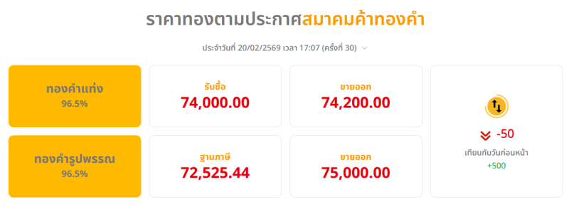 สรุปราคาทองวันนี้ 20 กุมภาพันธ์ 2569 สมาคมค้าทองคำ ประกาศราคาทองคำครั้งที่ 1 (เปิดตลาด) เมื่อเวลา 09.02 น. ปรับตัวขึ้น 50 บาท