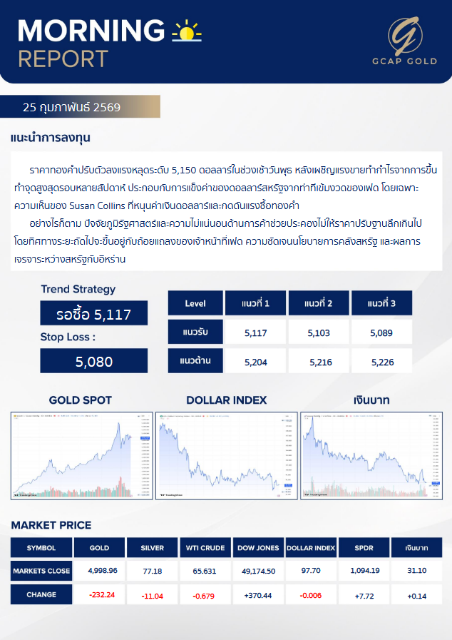 เเนะนำการลงทุนด้านทองคำ รอบเช้าวันนี้ 25 กุมภาพันธ์ 2569 โดย บริษัท จีแคป จำกัด ราคาทองคำปรับตัวลงแรงหลุดระดับ 5,150 ดอลอลลาร์ในช่วงเช้าวันพุธ หลังเผชิญแรงขายทำกำไรจากการขึ้นทำจุดสูงสุดรอบหลายสัปดาห์ ประกอบกับการแข็งค่าของดอลลาร์สหรัฐจากท่าทีเข้มงวดของเฟด โดยเฉพาะความเห็นของ Susan Collins ที่หนุนค่าเงินดอลลาร์และกดดันแรงซื้อทองคำ