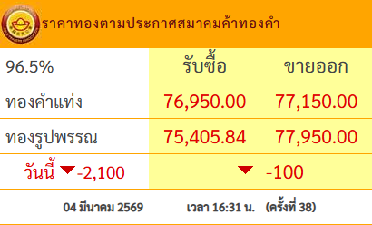 ราคาทองคำวันนี้ 4 มีนาคม 2569 โดย สมาคมค้าทองคำ ประกาศราคาทองครั้งที่ 1 (เปิดตลาด) เมื่อเวลา 09.04 น. ดิ่งแรง 1,550 บาท แตะระดับ 79,650.00 บาท โดนตลอดทั้งวันจนถึงเวลา 17.00 น. ราคาทองคำปรับอีก 38 ครั้ง ปรับครั้งล่าสุดเมื่อเวลา 16:31 น. ลดลง 100 บาท รวมแล้วปรับลง 2,100 บาท ส่งผลให้ราคาทองคำล่าสุดอยู่ที่
