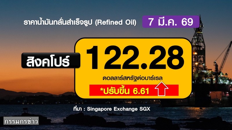 ทางด้านตลาดสิงคโปร์ ราคาน้ำมันสำเร็จรูปมีการปรับตัวเพิ่มขึ้น 6.61 ดอลลาร์ ขยับไปอยู่ที่ระดับ 122.28 ดอลลาร์ต่อบาร์เรล จากราคาก่อนหน้านี้ที่ระดับ 115.67 ดอลลาร์ต่อบาร์เรล