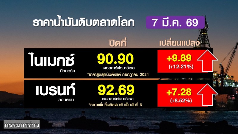 วันที่ 7 มีนาคม 2569 สรยุทธ สุทัศนะจินดา กรรมกรข่าว ได้รรายงาน สถานการณ์ตลาดพลังงานโลกเกิดความตึงตัวอย่างหนัก ภายหลังจากที่ความขัดแย้งในภูมิภาคตะวันออกกลางได้ขยายวงกว้างขึ้น ซึ่งส่งผลทำให้ราคาน้ำมันพุ่งทะยานขึ้นอย่างรุนแรง โดยเฉพาะอย่างยิ่งหลังจากการประกาศปิดช่องแคบฮอร์มุซที่ส่งผลกระทบโดยตรงต่อเส้นทางการขนส่งน้ำมันที่สำคัญของโลก
