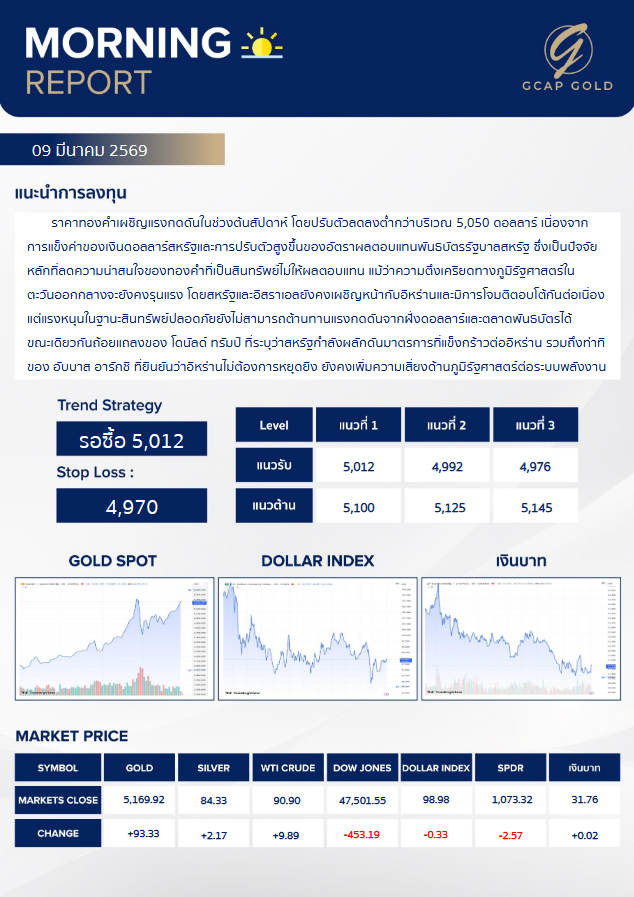 เเนะนำการลงทุนด้านทองคำ รอบเช้าวันนี้ 9 มีนาคม 2569 โดย บริษัท จีแคป จำกัด ราคาทองคำเผชิญแรงกดดันในช่วงต้นสัปดาห์ โดยปรับตัวลดลงต่ำกว่าบริเวณ 5,050 ดอลลาร์ เนื่องจาก การแข็งค่าของเงินดอลลาร์สหรัฐและการปรับตัวสูงขึ้นของอัตราผลตอบแทนพันธบัตรรัฐบาลสหรัฐ ซึ่งเป็นปัจจัยหลักที่ลดความน่าสนใจของทองคำที่เป็นสินทรัพย์ไม่ให้ผลตอบแทน แม้ว่าความตึงเครียดทางภูมิรัฐศาสตร์ในตะวันออกกลางจะยังคงรุนแรง