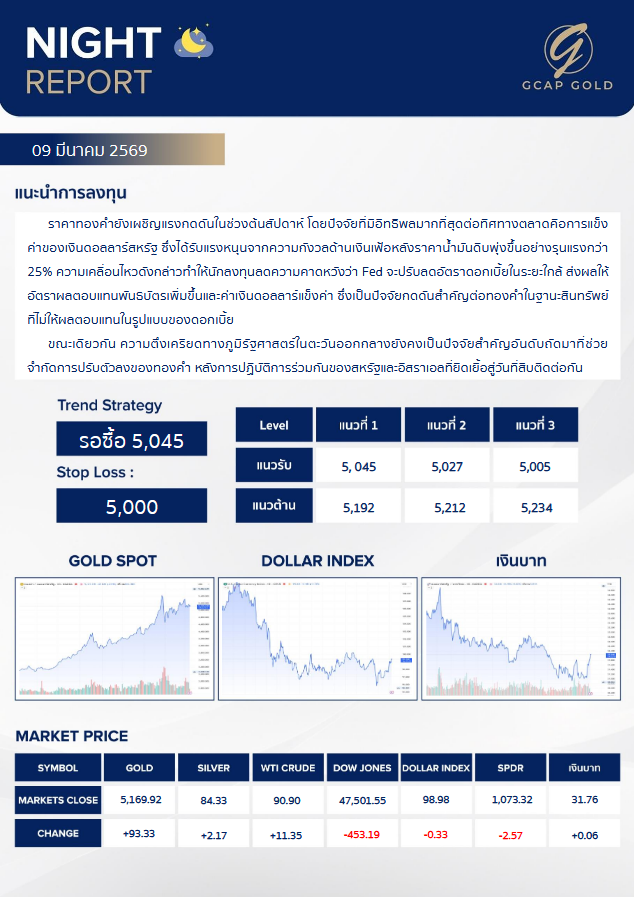 เเนะนำการลงทุนด้านทองคำ รอบเย็นวันนี้ 9 มีนาคม 2569 โดย บริษัท จีแคป จำกัด ราคาทองคำยังเผชิญแรงกดดันในช่วงต้นสันสัปดาห์ โดยปัจจัยที่มีอิทธิพลมากที่สุดต่อทิศทางตลาดคือการแข็งค่าของเงินดอลลาร์สหรัฐ ซึ่งได้รับแรงหนุนจากความกังวลด้านเงินฟ้อหลังราคาน้ำมันดิบพุ่งขึ้นอย่างรุนแรงกว่า 25%