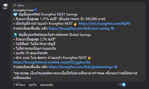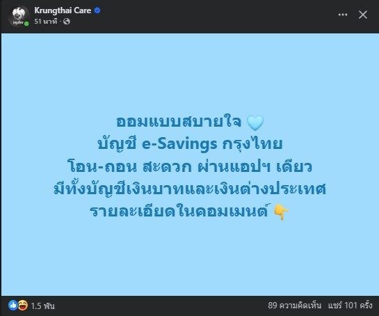 ล่าสุด วันที่ 10 มีนาคม 2569 ทางธนาคารกรุงไทย ได้ออกมาเคลื่อนไหวผ่านทางโพสต์เฟซบุ๊ก โดยระบุข้อความเชิญชวนว่า ออมแบบสบายใจ บัญชี e-Savings กรุงไทย สามารถโอนและถอนได้อย่างสะดวกผ่านแอปพลิเคชันเดียว ซึ่งมีให้บริการทั้งบัญชีเงินบาทและบัญชีเงินต่างประเทศ