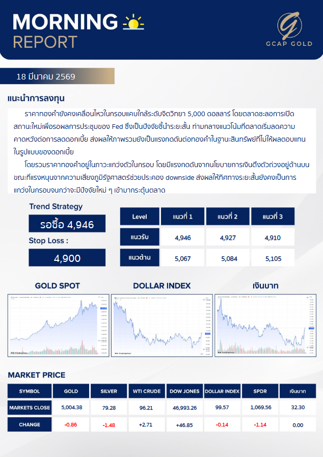 เเนะนำการลงทุนด้านทองคำ รอบเช้าวันนี้ 18 มีนาคม 2569 โดย บริษัท จีแคป จำกัด ราคาทองคำยังคงเคลื่อนไหวในกรอบแคบใกล้ระดับจิตวิทยา 5,000 ดอลลาร์ โดยตลาดชะลอการเปิดสถานะใหม่เพื่อรอผลการประชุมของ Fed ซึ่งเป็นปัจจัยชี้นำระยะสั้นท่ามกลางแนวโน้มที่ตลาดเริ่มลดความคาดหวังต่อการลดดอกเบี้ย ส่งผลให้ภาพรวมยังเป็นแรงกดดันต่อทองคำ ในฐานะสินทรัพยัพย์ที่ไม่ให้ผลตอบแทน ในรูปแบบของดอกเบี้ย