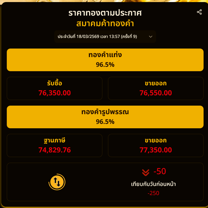 สมาคมค้าทองคำ รายงานว่า ราคาทองวันนี้ 18 มีนาคม 2569 เวลา 13:57 น. ราคาทองครั้งที่ 9 ปรับลง 250 บาท โดยมีรายละเอียดดังนี้